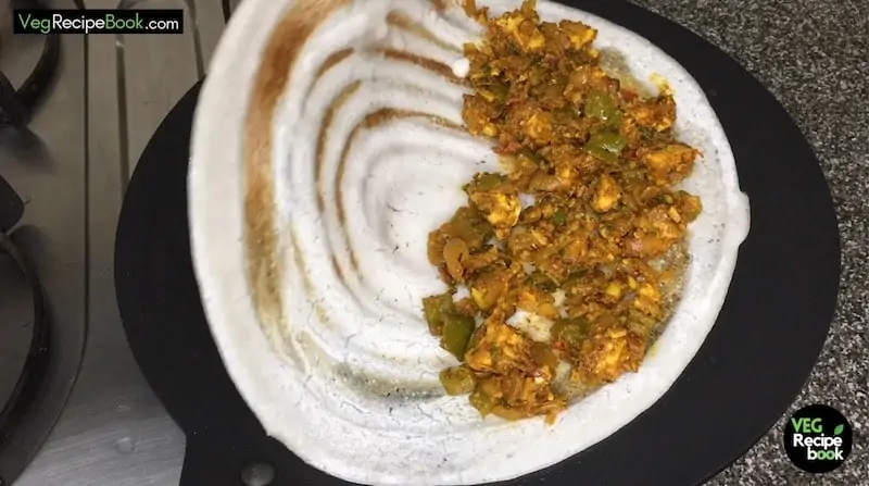 - Let the chilli paneer dosai cook for a few minutes until the bottom of the dosa starts appearing golden brown. You need to cook only one side of the dosa, this will make the dosa very crispy.