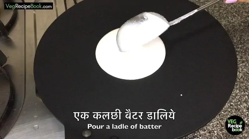 - When the dosa tawa is hot enough pour a ladle of batter into the center of the hot Tawa.