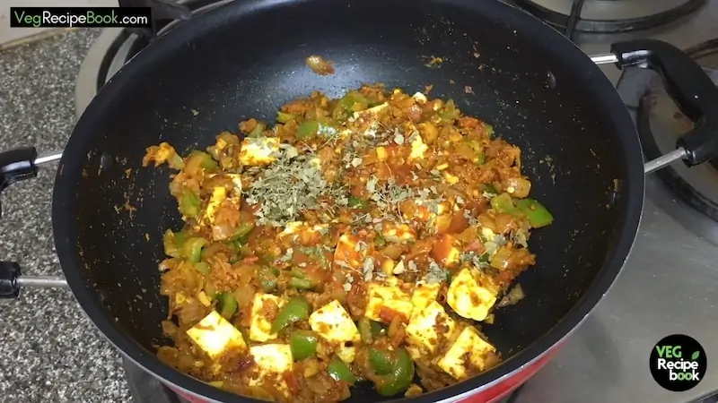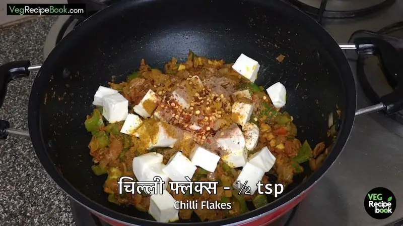 - Further, add Paneer (cottage cheese), ½ tsp of Salt, Garam Masala, Amchur Powder, and Chilli Flakes. Mix all the ingredients gently.