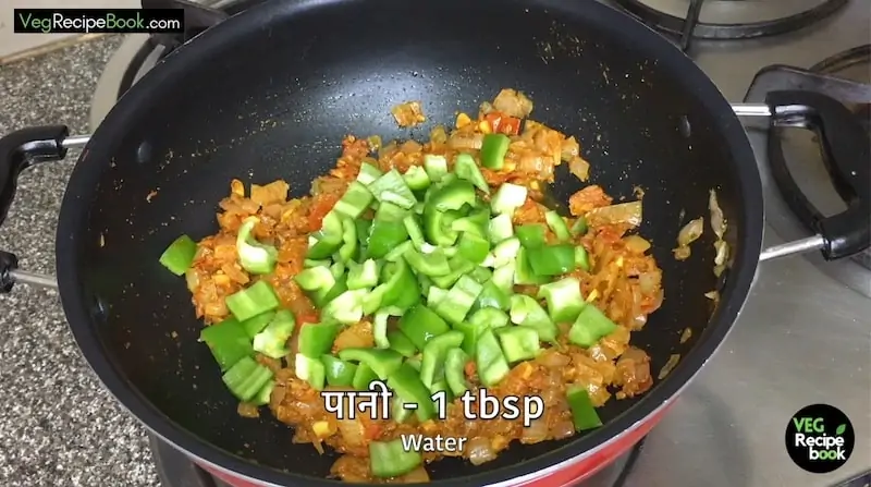 - Further, add chopped capsicum and 1 tbsp of water and mix well.